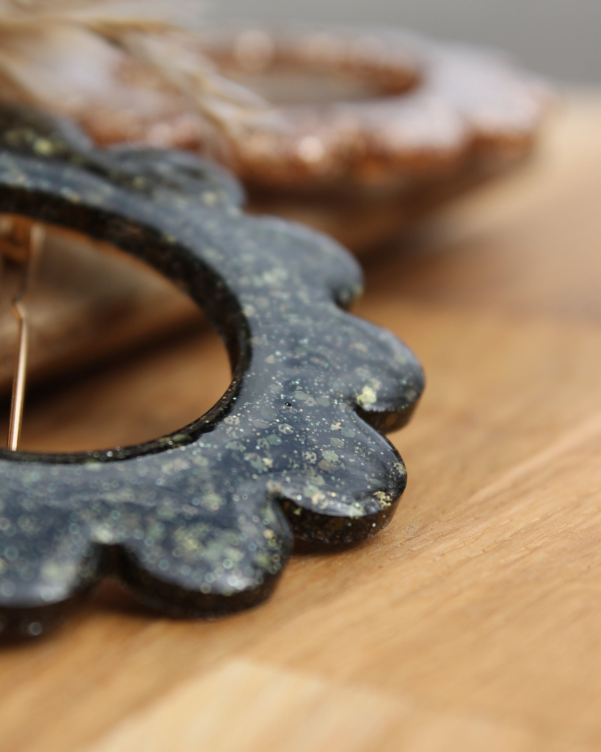 Finition : résine pailletée / attache métal doré