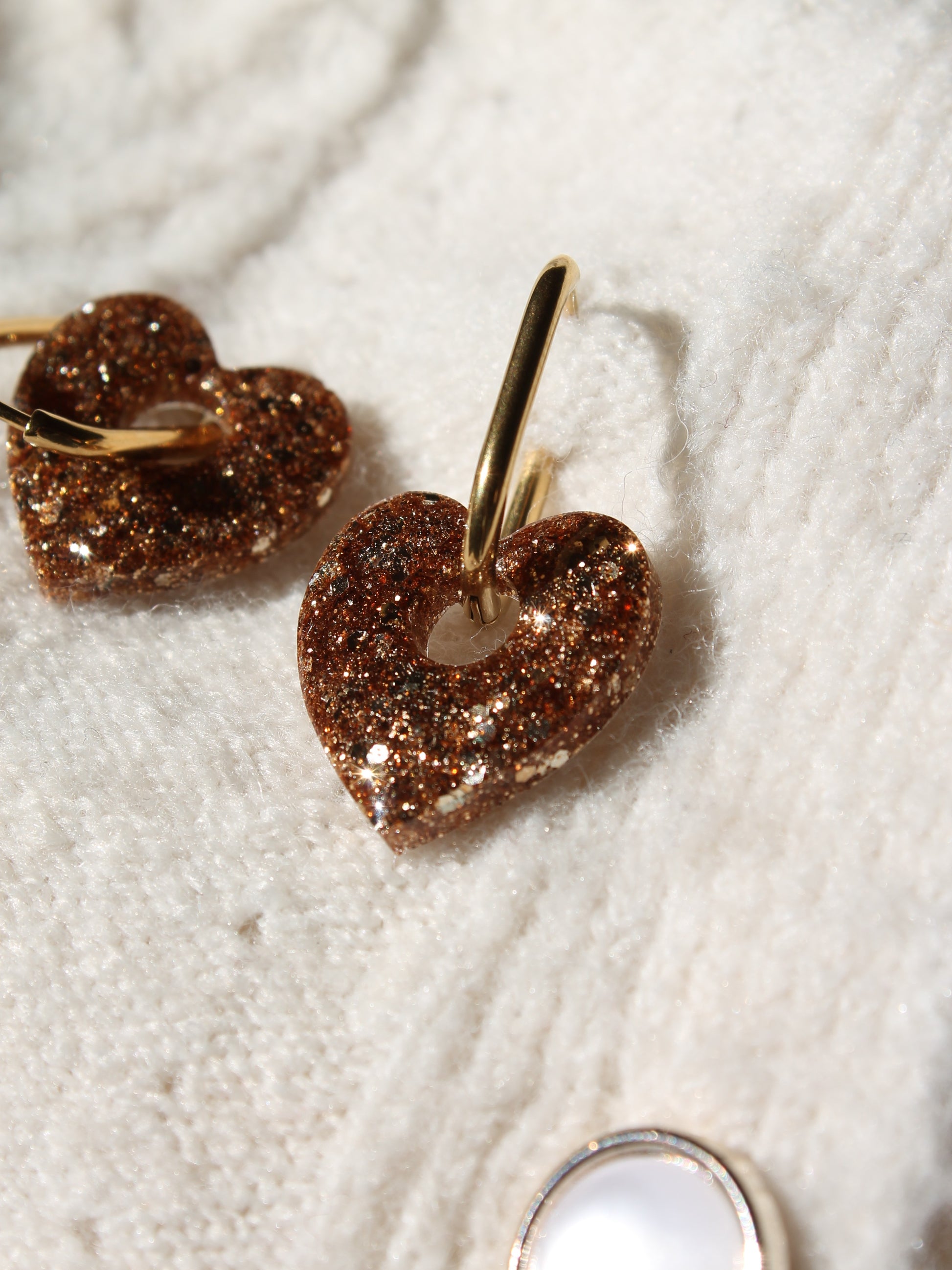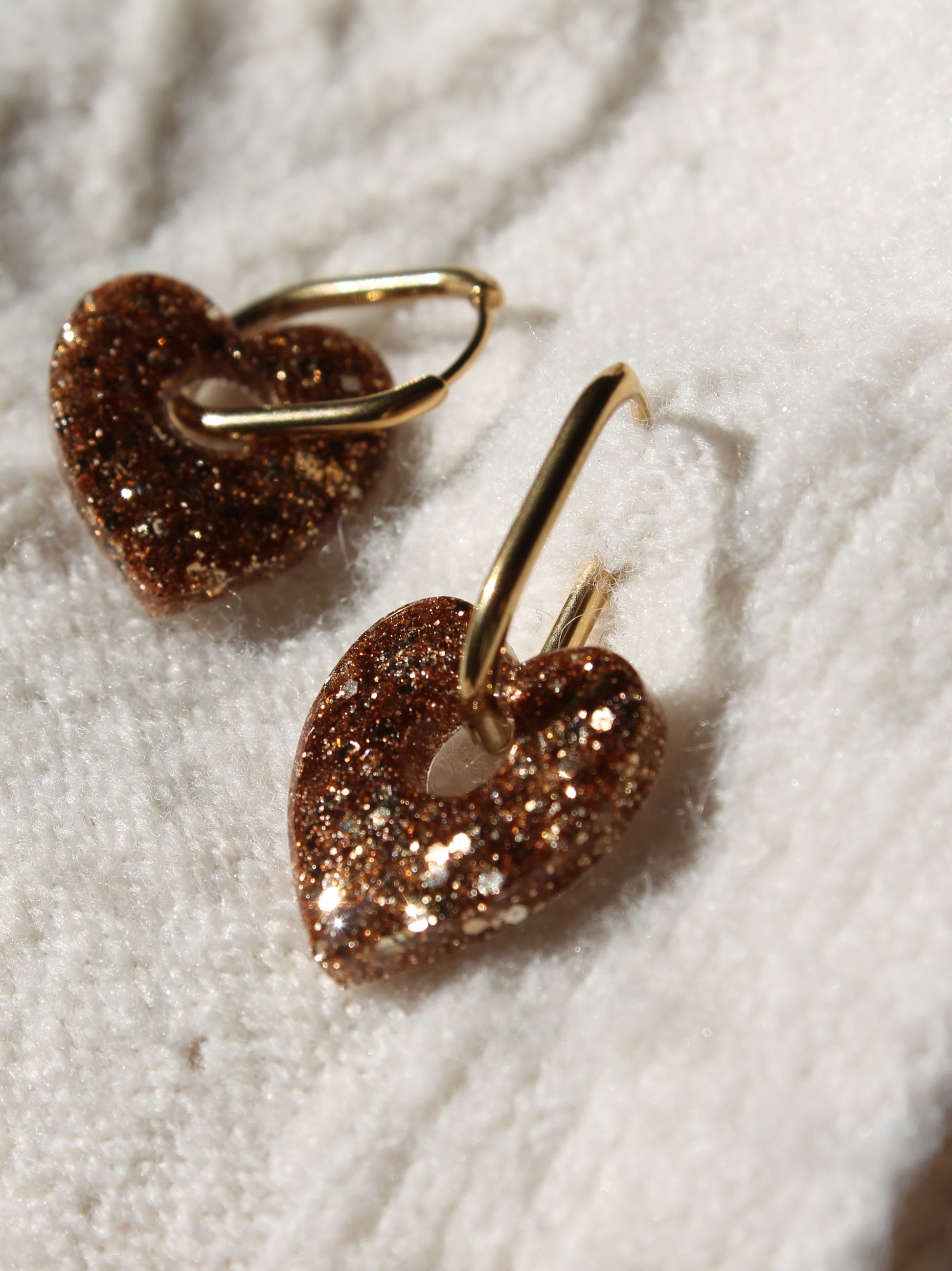Des créoles fines associées aux pampilles Amor — des petit cœur bombés, toujours façonnées à la main.