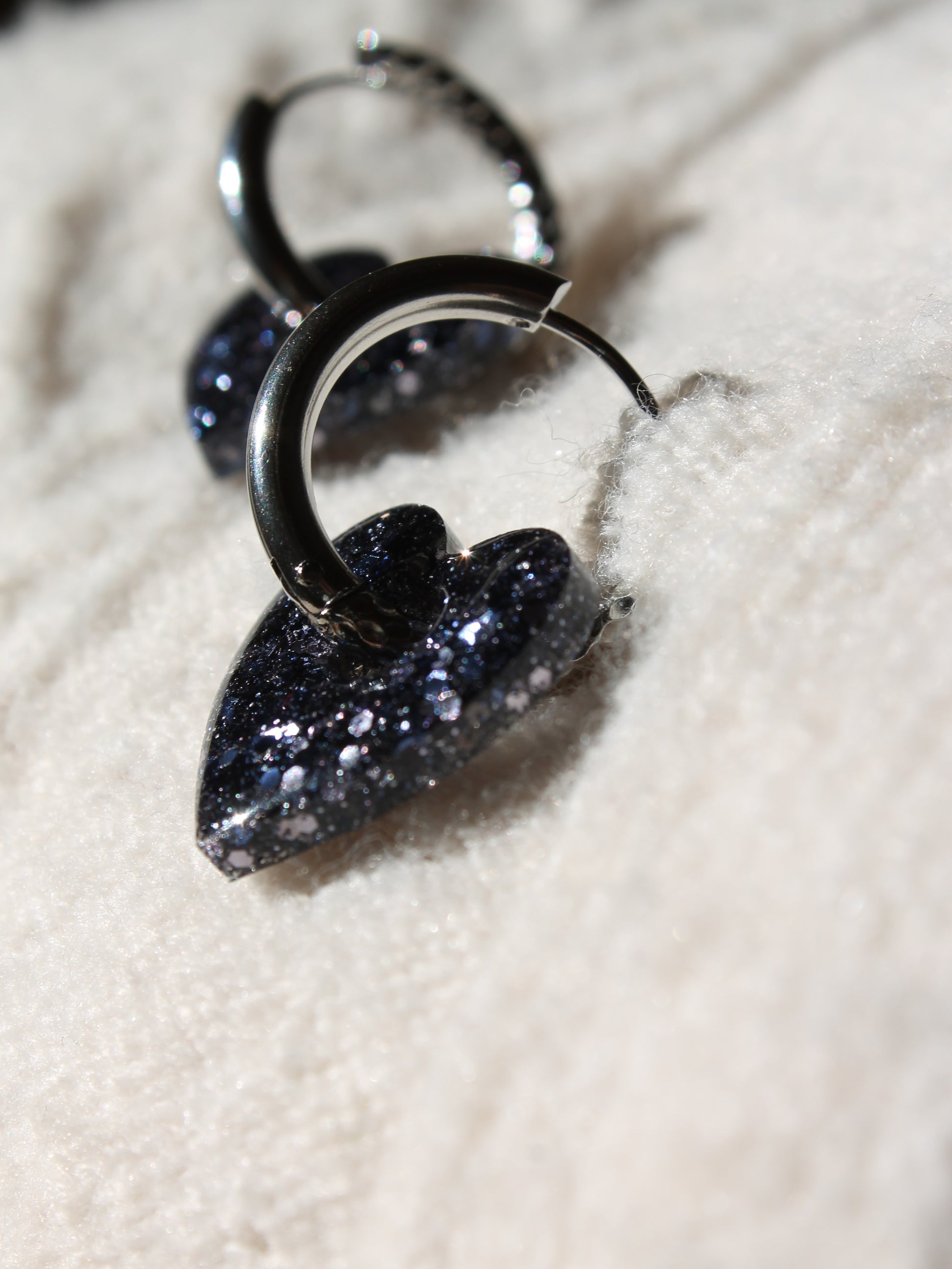 Des créoles fines associées aux pampilles Amor — des petit cœur bombés, toujours façonnées à la main.
