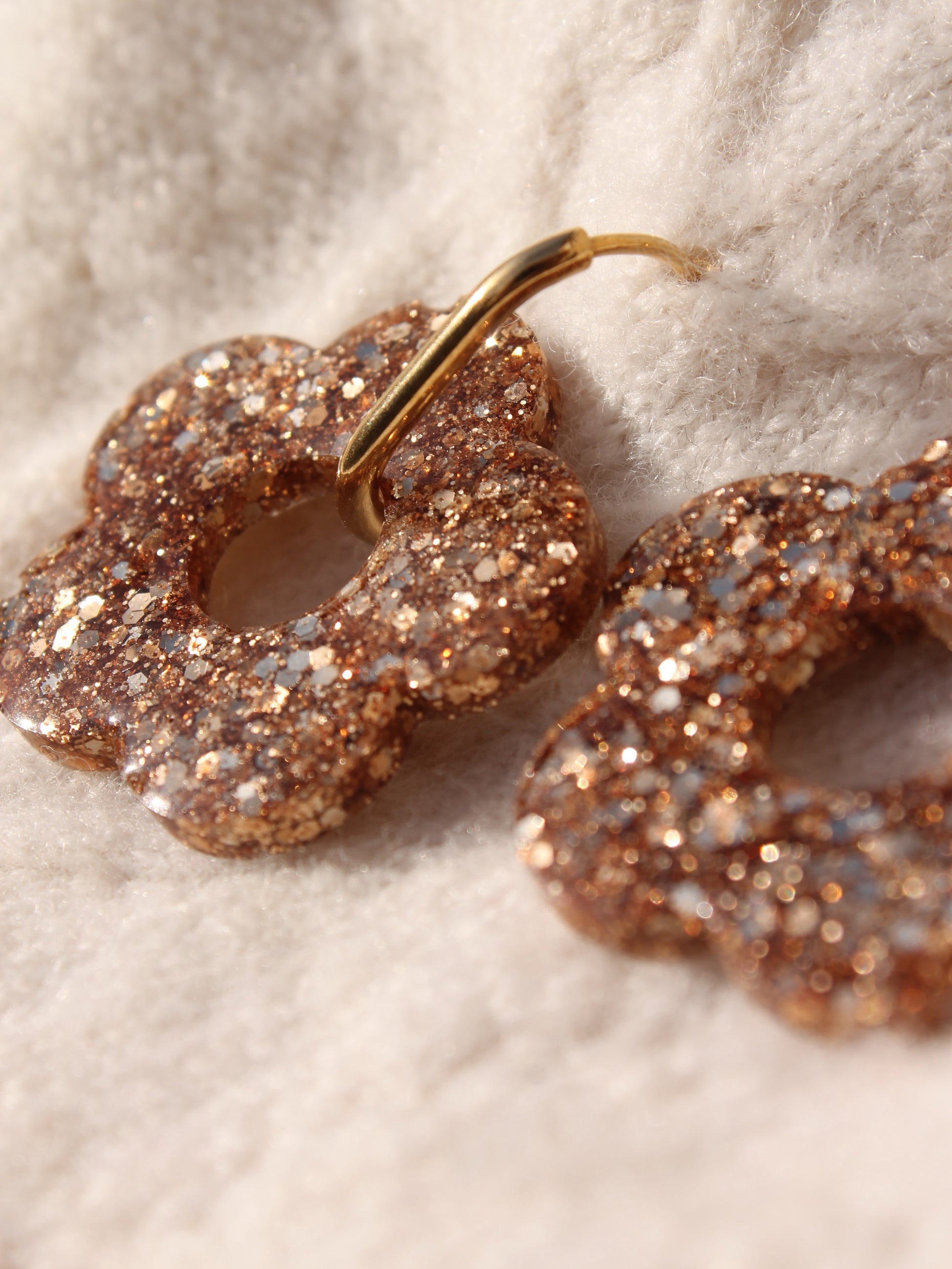 Des créoles fines associées aux pampilles Bloom XL — des fleurs plus grandes et plus affirmées, toujours façonnées à la main.