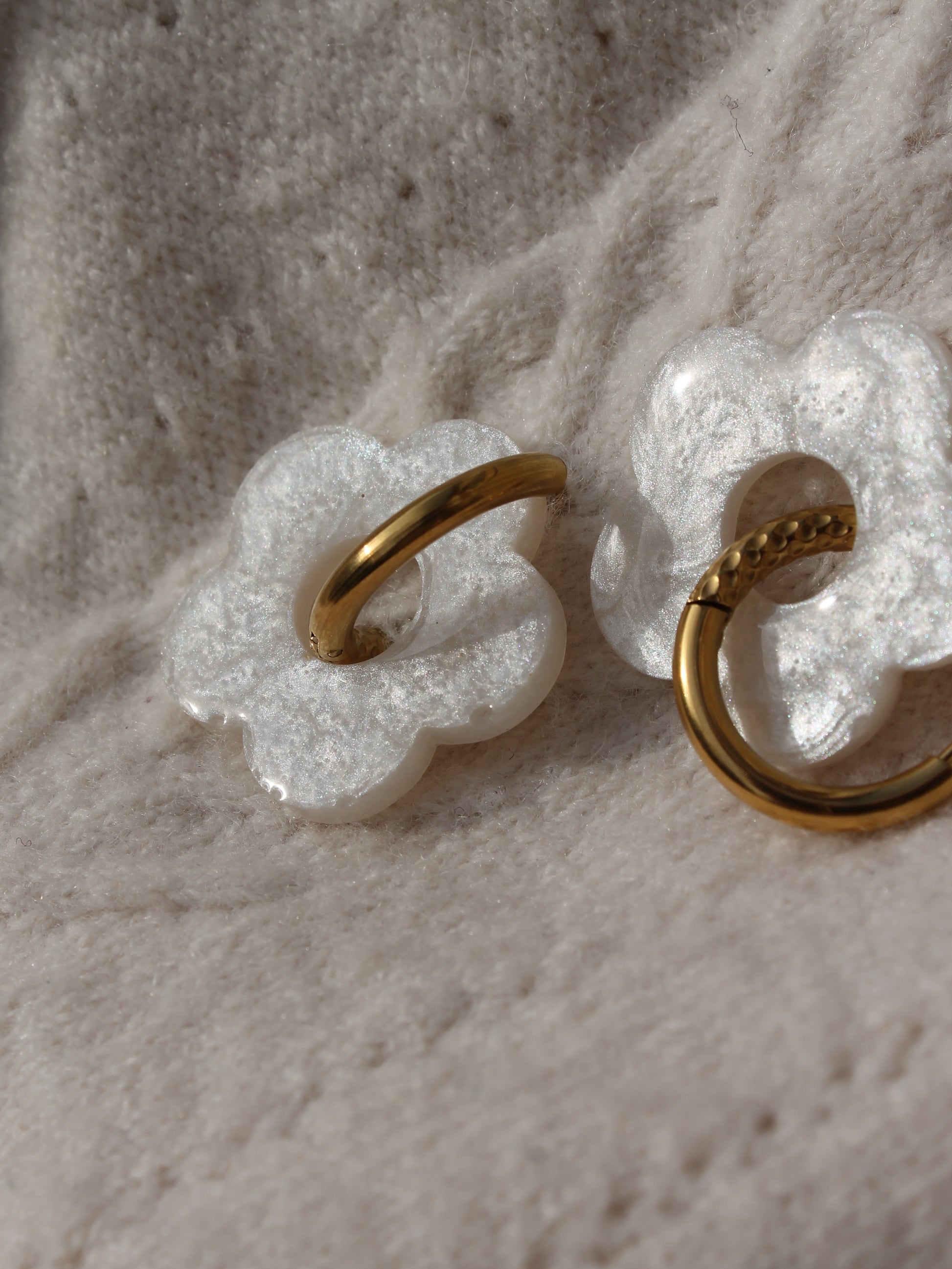 Des créoles fines associées aux pampilles Bloom XL — des fleurs plus grandes et plus affirmées, toujours façonnées à la main.