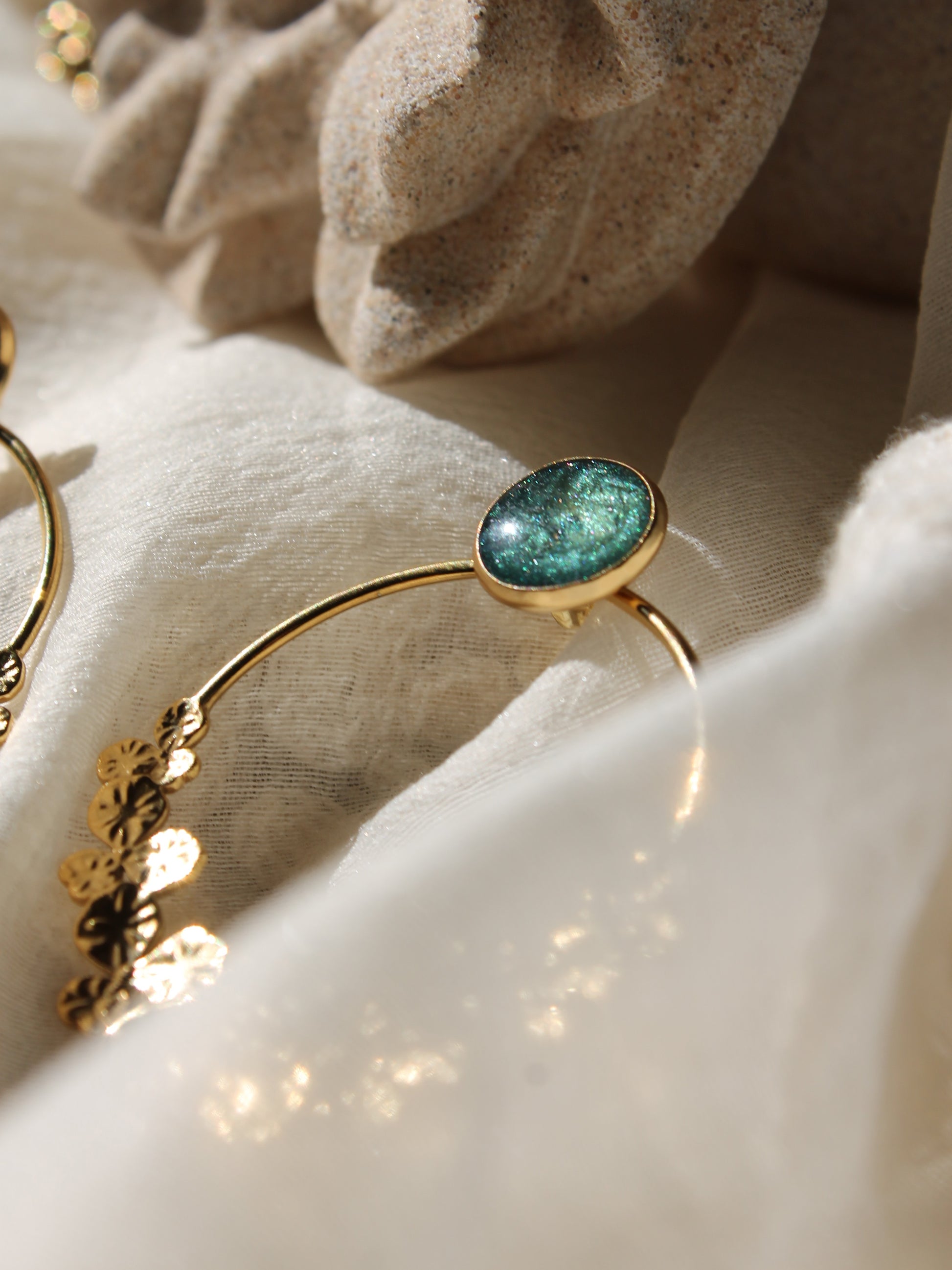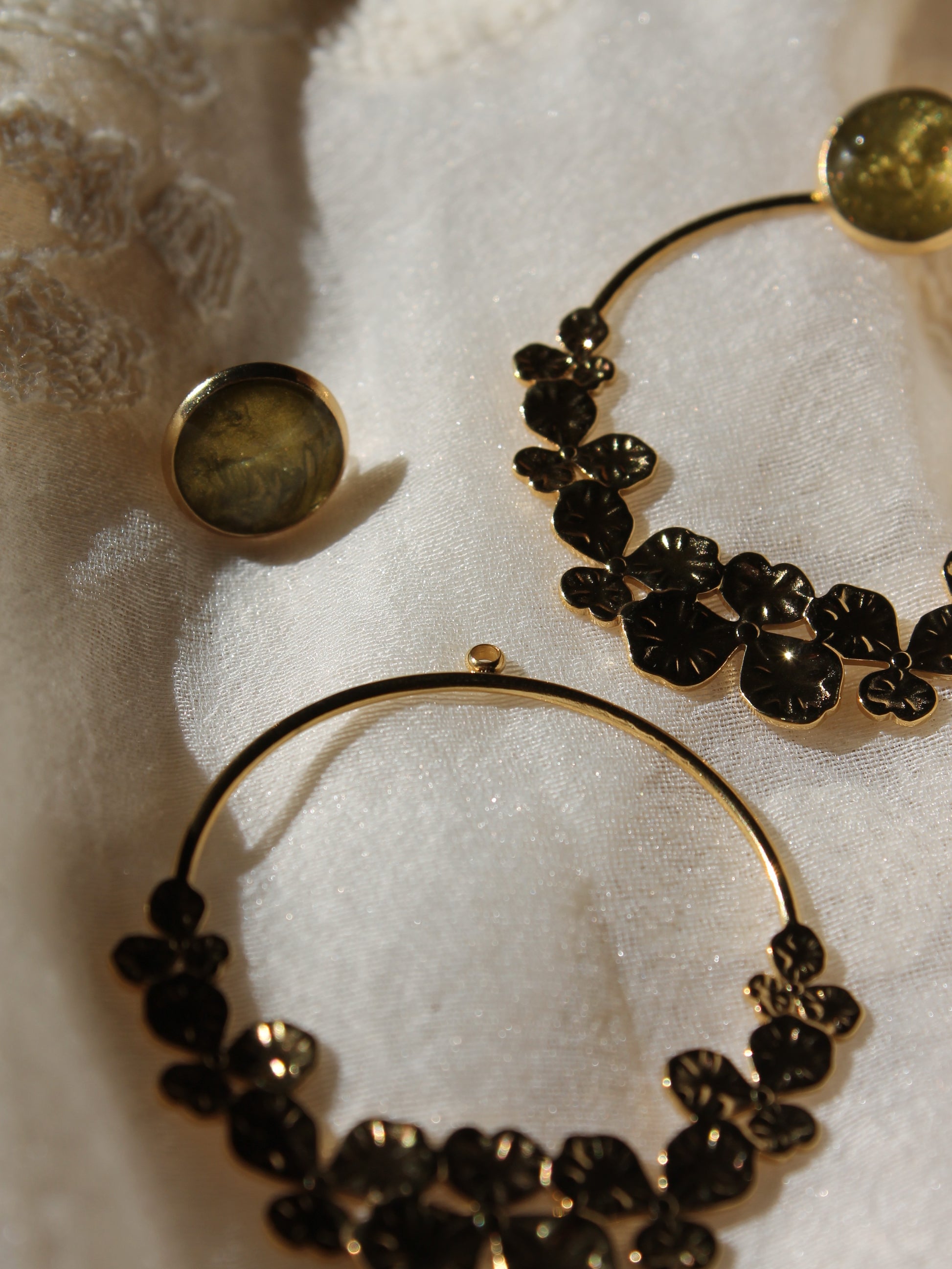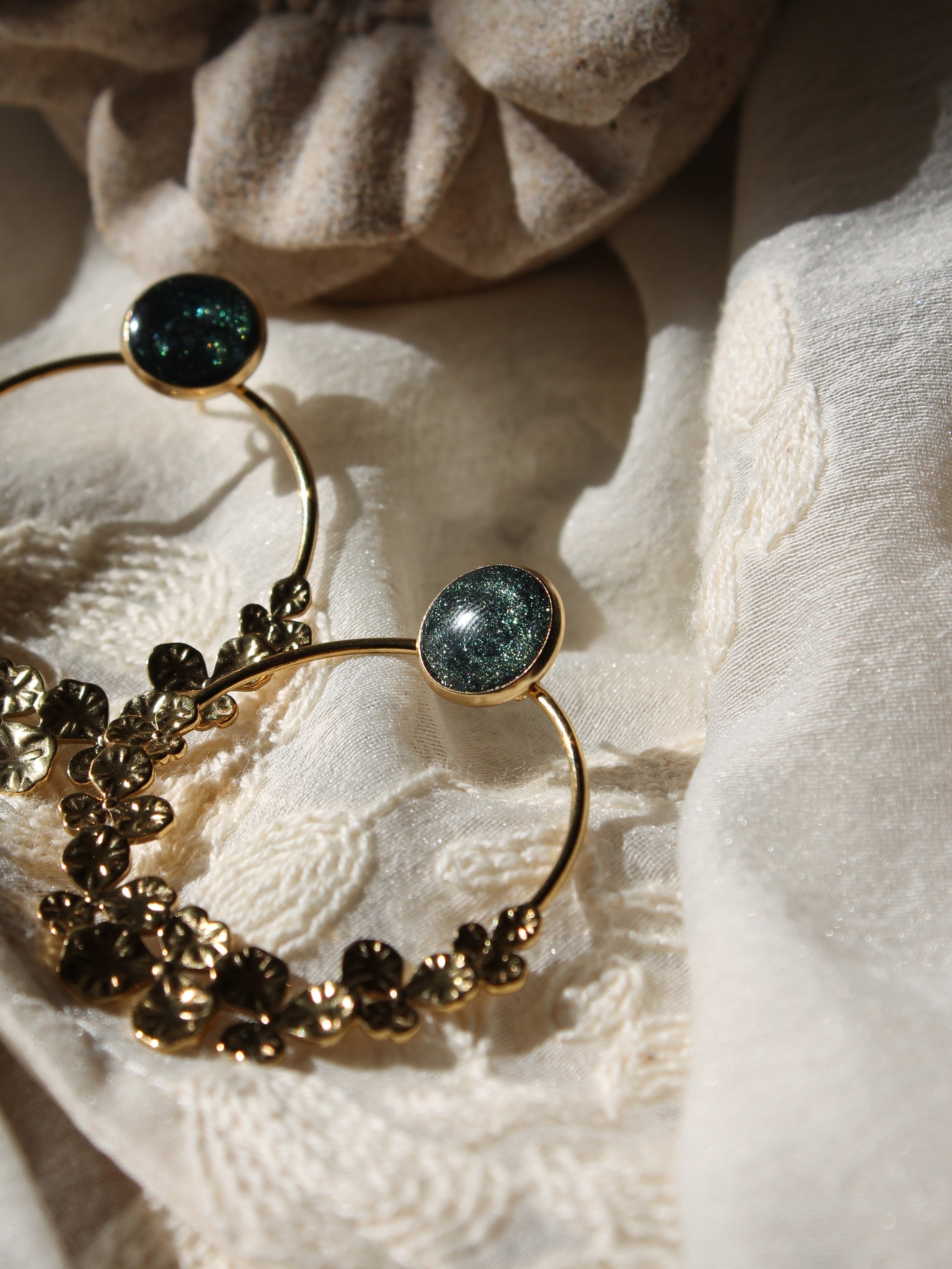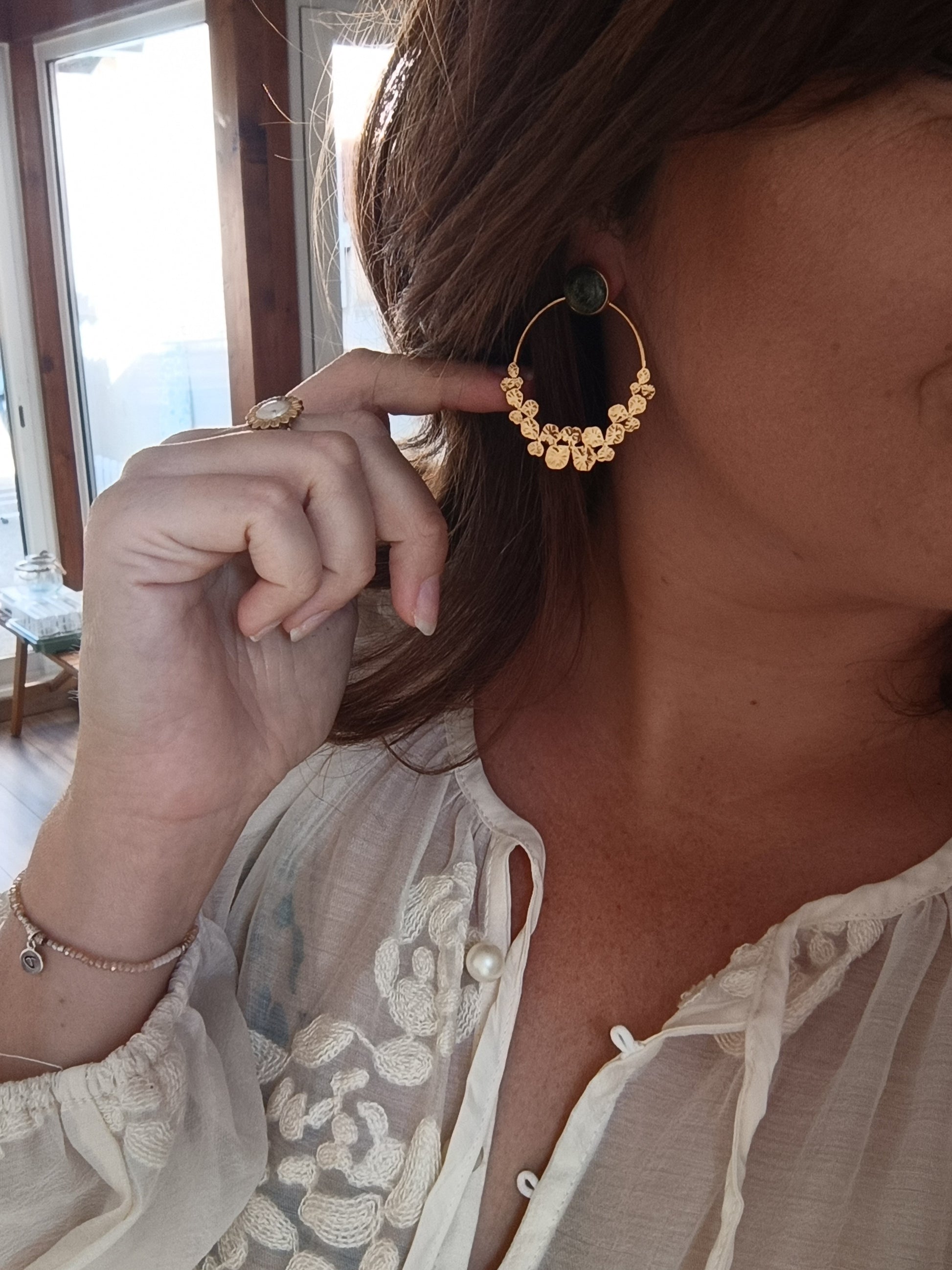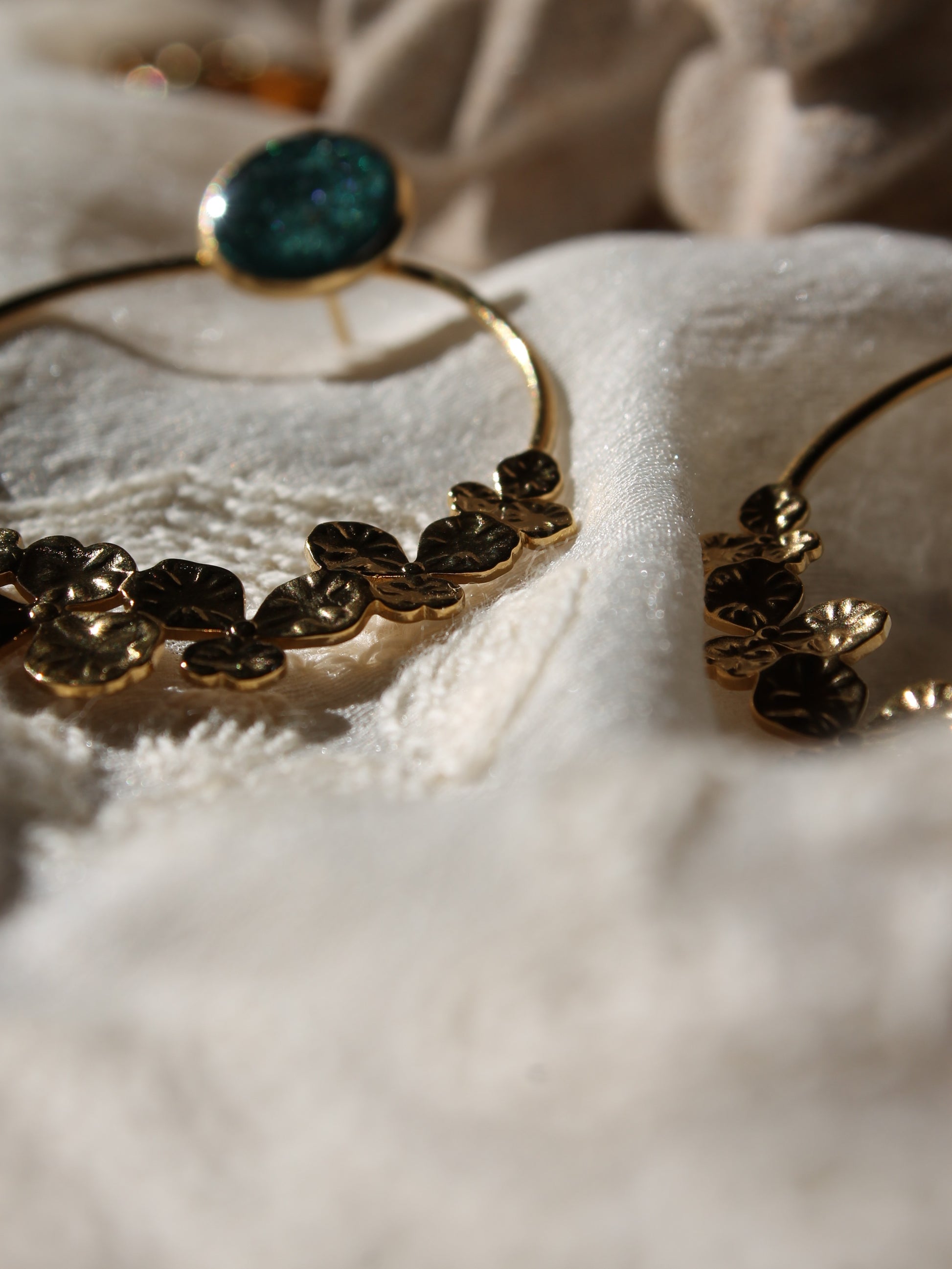 Les Flora sont des boucles en acier inoxydable et sont disponibles en dorées ou en argentées.