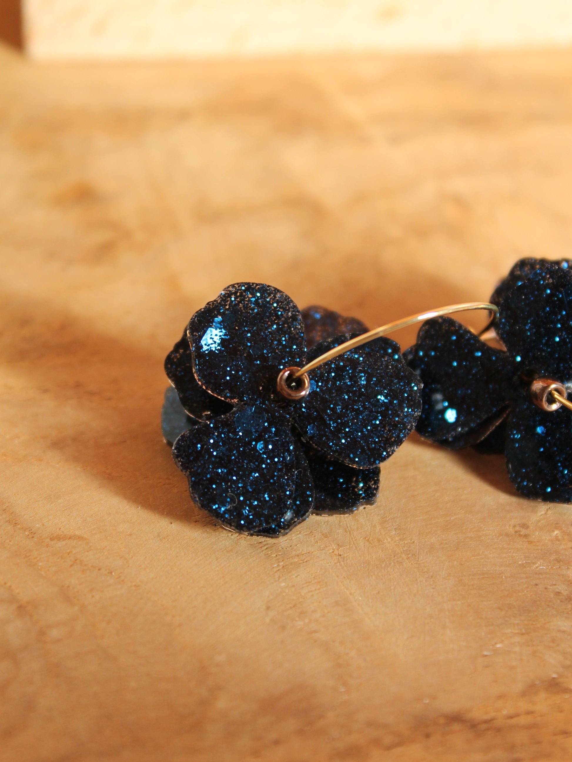 Des créoles fines et légères, dorées ou argentées, ornées de trois pétales faits main en résine. Chaque pétale est unique, teinté de paillettes ou pigments selon l’inspiration.