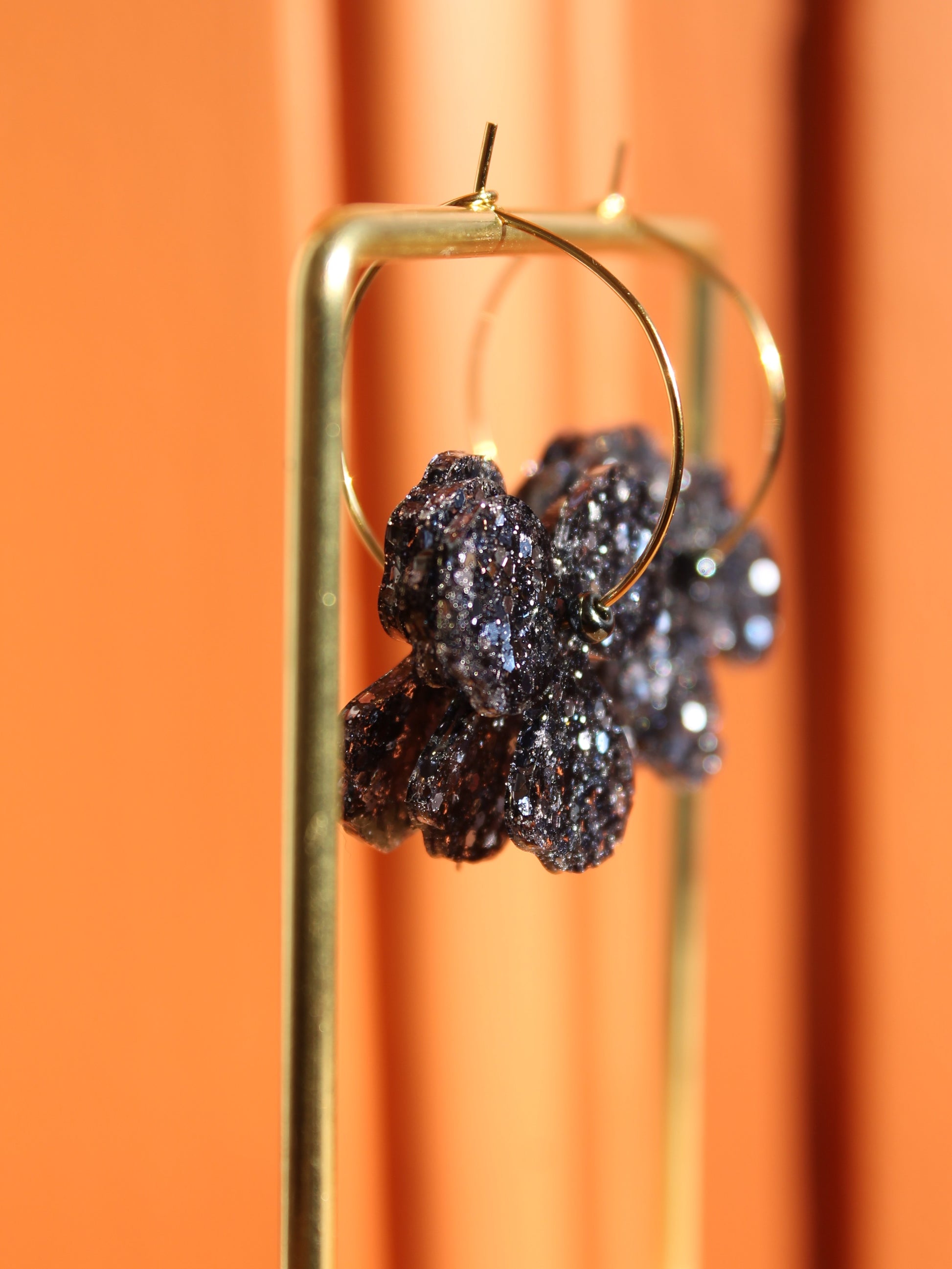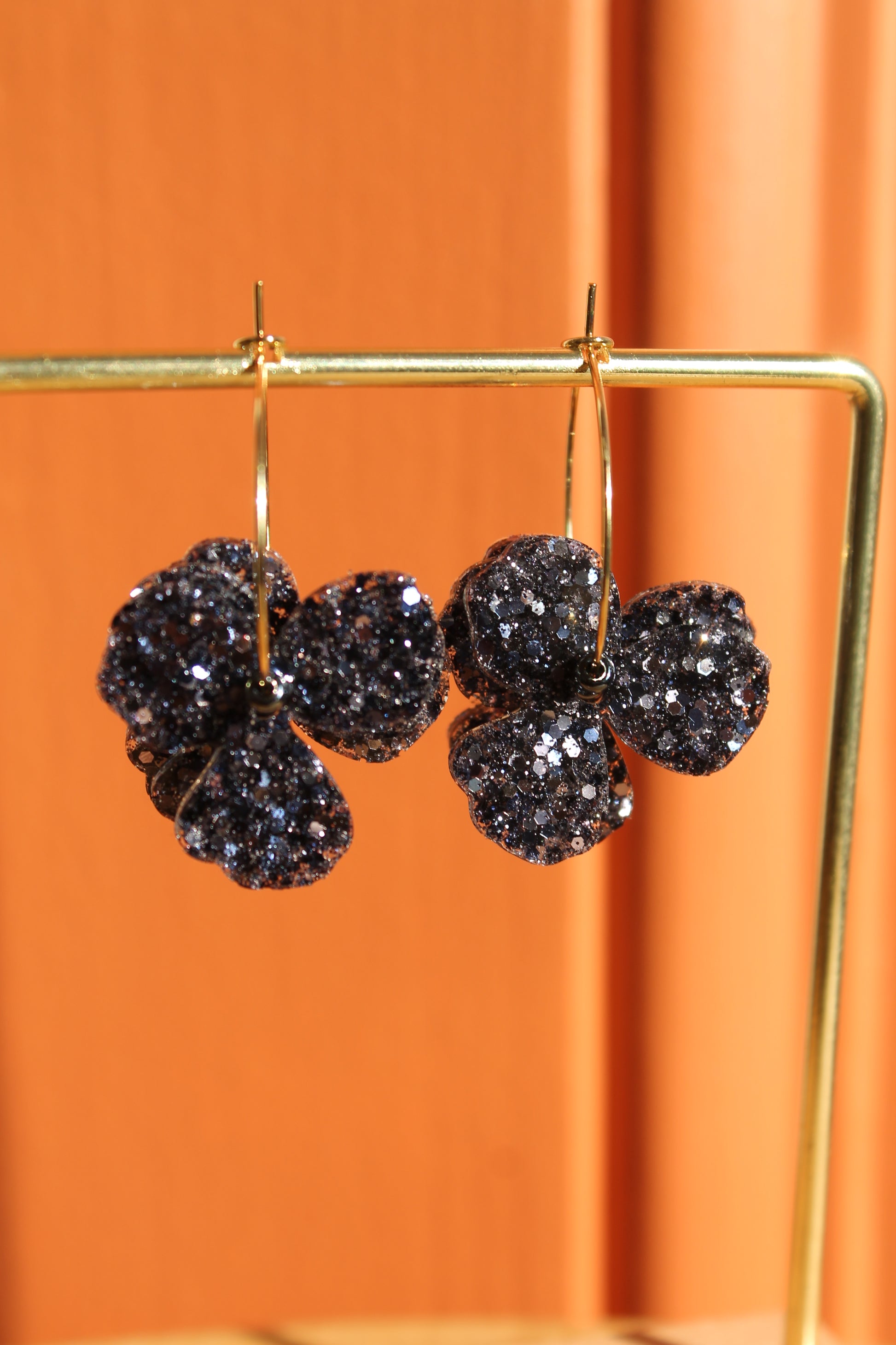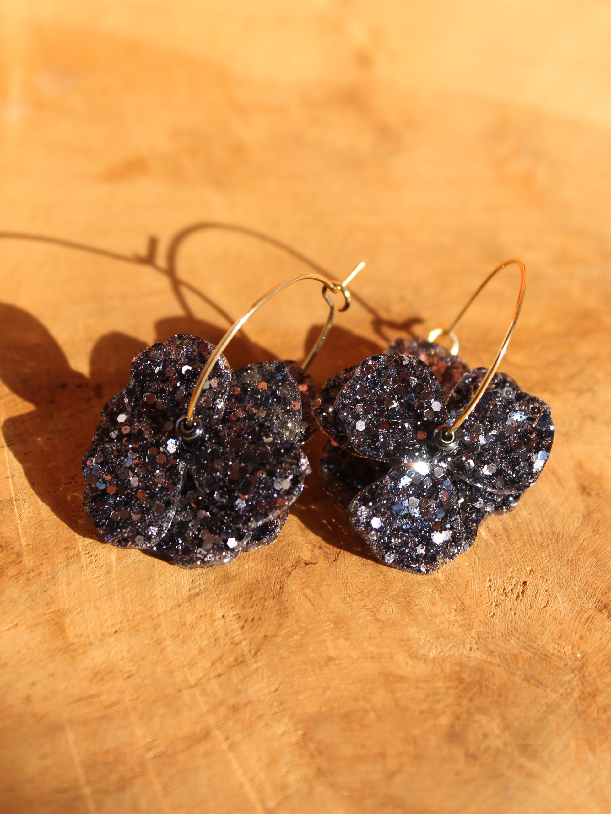 Des créoles fines et légères, dorées ou argentées, ornées de trois pétales faits main en résine. Chaque pétale est unique, teinté de paillettes ou pigments selon l’inspiration.